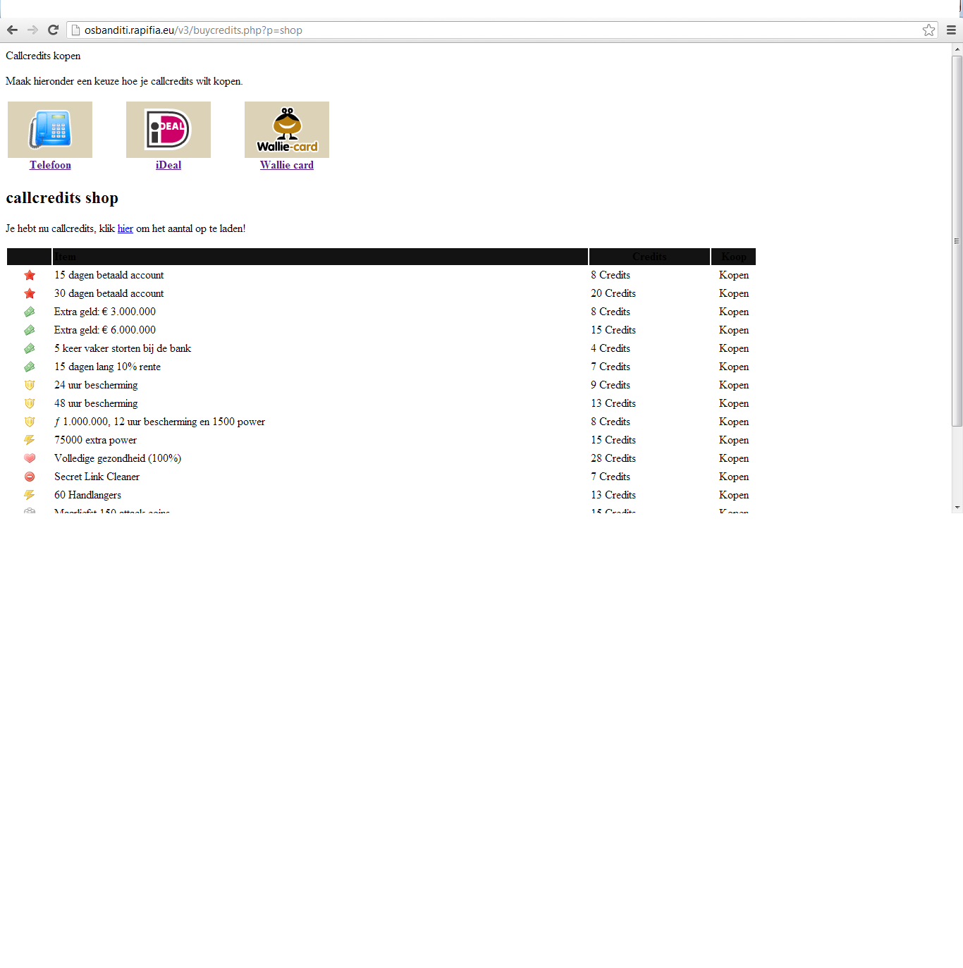 http://osbanditi.rapifia.eu/v3/index.php?a=koop_callcreditsDus niet uit het menu (menu is nog niet bijgewerkt). Verder klopt het wel dat je nog niet kunt betalen (immers de API is nog niet geïntegreerd) het gaat dus puur om de styling ervan.
