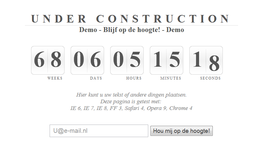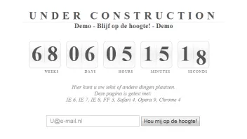 <h1>UNDER CONSTRUCTION</h1>		<h2 class="subtitle">Demo - Blijf op de hoogte! - Demo</h2>
