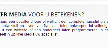 <p>Zoekt u een fris webdesign, een opvallend logo of wellicht een complete huisstijl die past bij uw identiteit? Spikker Media ontwerpt, ontwikkelt en levert, van flyers en folderontwerpen tot volledige concepten en SEO diensten op maat. Wilt u een website of een onderdeel laten programmeren in een van de gangbare programmeertalen? U heeft in Spikker Media uw specialist! </p>