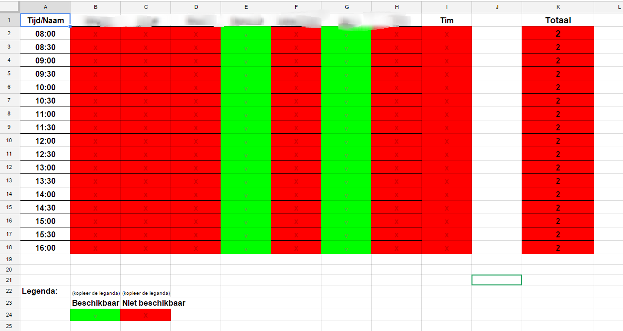 Een voorbeeld van wat ik nu gebruik via Google Drive is bijgevoegd. Ik heb dan voor elke toekomstige dag een tab gemaakt. Maar ik dien telkens een nieuwe toe te voegen, dit is uiteraard tergend werk. Vandaar dat ik een oplossing zoek.