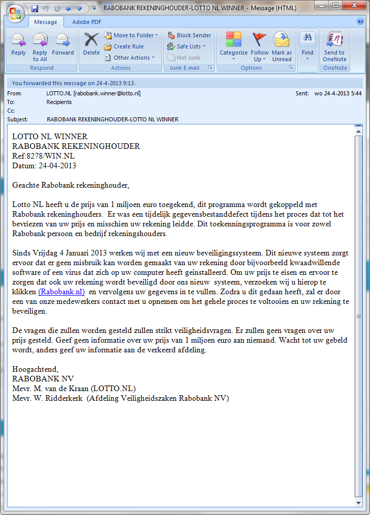 In de bijlage zien jullie de mail die ik vanmorgen ontvangen had over me zogenaamde prijs.Wat is jullie mening hierin?